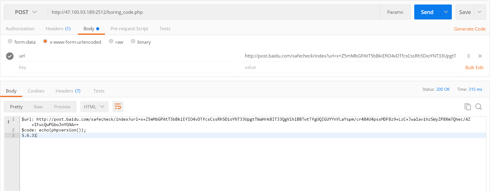1 2 3 4 5 6 7 8 9 10 11 12 13 14 15 16 17 18 19 20 21 22 23 24 25 26 27 28 29 30 31 32 33 34 35 36 37 <?php function is_valid_url ($url) { if (filter_var($url, FILTER_VALIDATE_URL)) { if (preg_match('/data:\/\//i' , $url)) { return false ; } return true ; } return false ; } if (isset ($_POST['url' ])) { $url = $_POST['url' ]; if (is_valid_url($url)) { print ('$url: ' .$url."\n" ); $r = parse_url($url); if (preg_match('/baidu\.com$/' , $r['host' ])) { $code = file_get_contents($url); print ('$code: ' .$code."\n" ); if (';' === preg_replace('/[a-z]+\((?R)?\)/' , NULL , $code)) { if (preg_match('/et|na|nt|strlen|info|path|rand|dec|bin|hex|oct|pi|exp|log/i' , $code)) { echo 'bye~' ; } else { eval ($code); } } } else { echo "error: host not allowed" ; } } else { echo "error: invalid url" ; } } else { highlight_file(__FILE__ ); } ?>