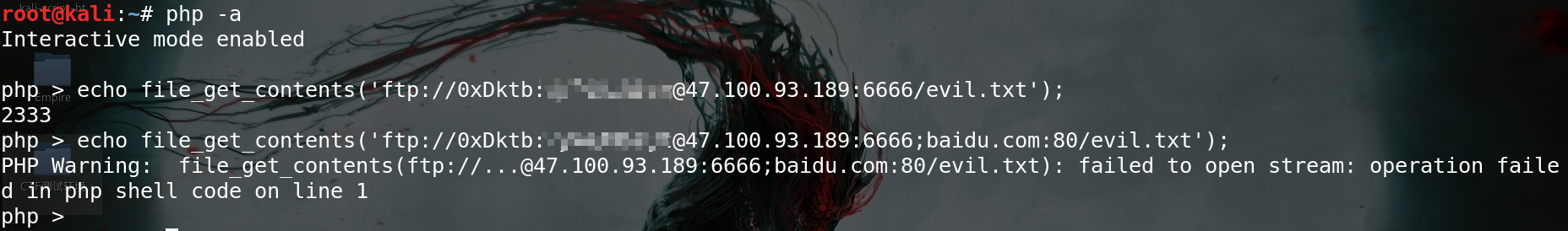 对于如何绕过filter_var(), preg_match() 和 parse_url(),我找到师傅的一篇博客 ,但这篇博客是针对curl的,在这题貌似并不适用 而且对这篇的一个bypass手法我有些懵 利用0://evil.com:port;baidu.com:80这样的url(0为传输协议,非http,为了绕过filter_var()) curl解析到;停止,这样就访问了0://evil.com:port,但是非http协议的话,比如ftp,我们直接访问ftp://evil.com:port,貌似取不到文件里的内容(先留个坑)
