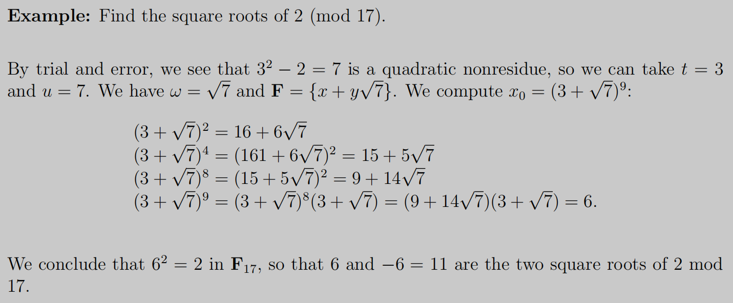 defsquare_root(a, p): assert(euler_judge(a, p) == True) if p % 4 == 3: b = pow(a, (p + 1) // 4, p) elif p % 8 == 5: c = pow(2 * a, (p - 5) // 8, p) i = (2 * a * c**2) % p b = (a * c * (i - 1)) % p else: t = getRandomRange(1, p) u = t**2 - a while euler_judge(u, p): t = getRandomRange(1, p) u = t**2 - a b, check = pow_in_Fp2(t, u, (p + 1) // 2, p) assert(check == 0) return b, -b % p