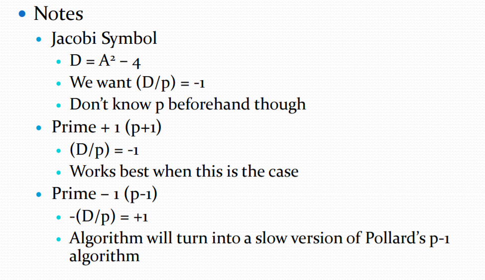 defWilliams_p_1(): R = 1 B = iroot(n, 2)[0] B = log(B) for pi in prime: for i in range(B//log(pi)): R *= pi while1: P = random.randint(2, B) p = Lucas_pow(P, R) if p > 1and p < n: return p