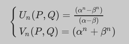 Lucas Functions:设$\alpha,\beta$是$x^{2}-Px+Q=0$的根,且有