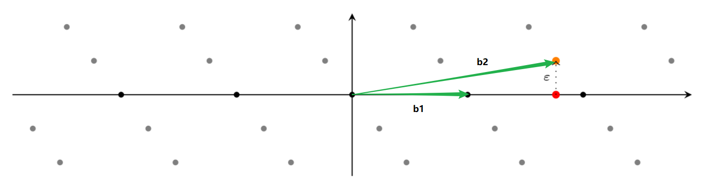Lemma 3.2.2. Let $\{\underline{b}_{1},…,\underline{b}_{n}\}$ be a basis for a lattice $L\subset Z^{n}$ and donate by $\lambda_1$ the shortest Euclidean length of a non-zero element of L. Let $\underline{\omega}\in R^{n}$ and let $\underline{v}\in L$ be a closest lattice point to $\underline{\omega}$. Define $\underline{e}=\underline{\omega}-\underline{v}$. Suppose that $\left|\underline{e}\right|<\lambda_1/2$ and let $M=\left|\underline{e}\right|$. Then $(\underline{e},M)$ is a shortest non-zero vector in the lattice L’ of the embedding technique.