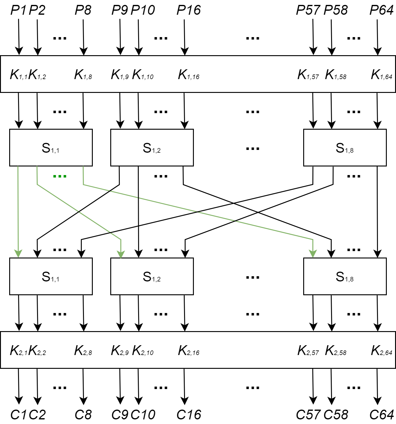 以$K_{2,1},K_{2,2},…,K_{2,8}$为例,取$u_{1}$为$S_{21}^{-1}(C_{1}\oplus K_{2,1}||C_{2}\oplus K_{2,2}||…||C_{8}\oplus K_{2,8})$的最高位比特