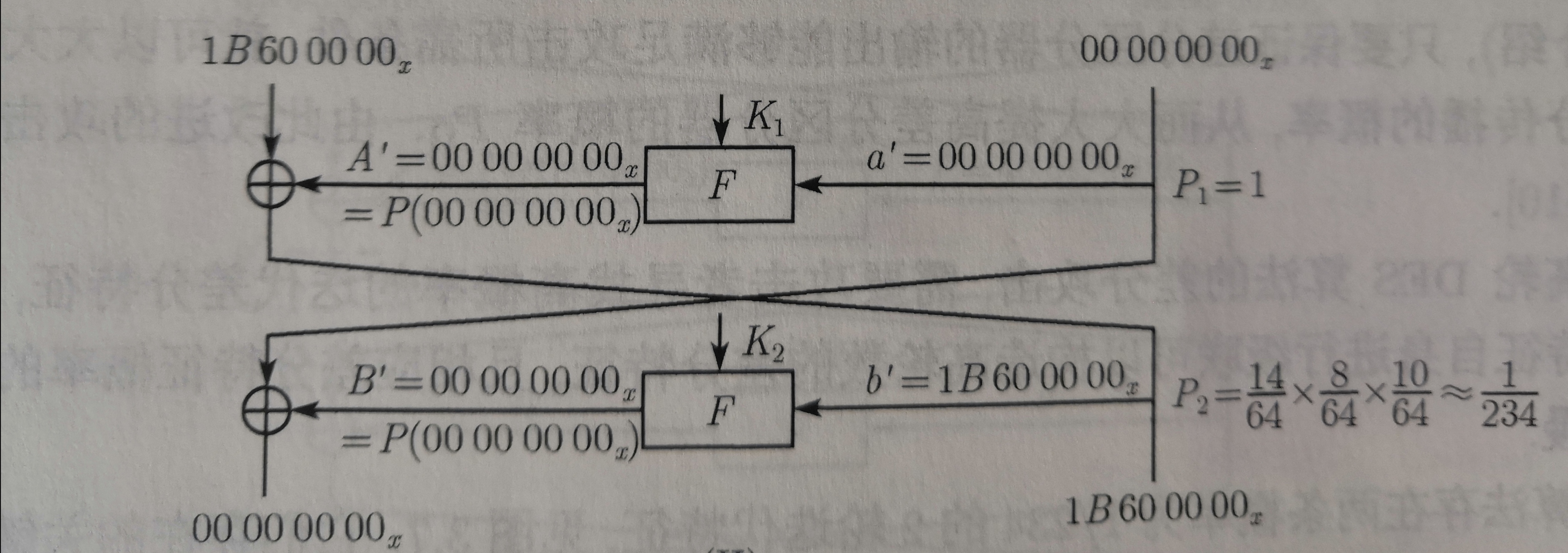 且对于非双射关系的S盒(如DES六进四出的S盒),即可能存在两轮迭代差分特征,如下图所示: