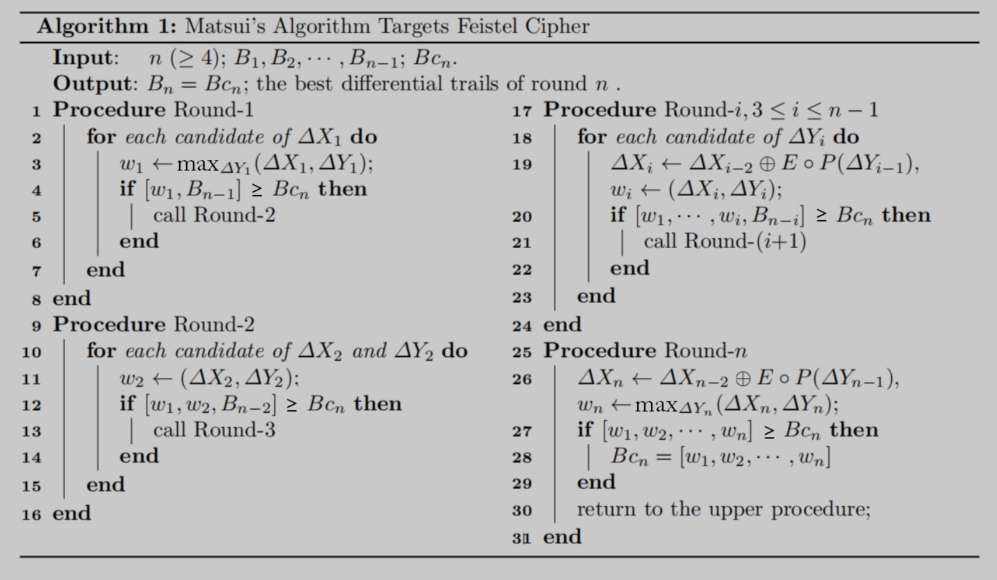 Matsui’s algorithm works by induction on the number of rounds and derives the best n-round weight B_n from the knowledge of all i-round best weight B_i (1 ≤ i ≤ n-1).