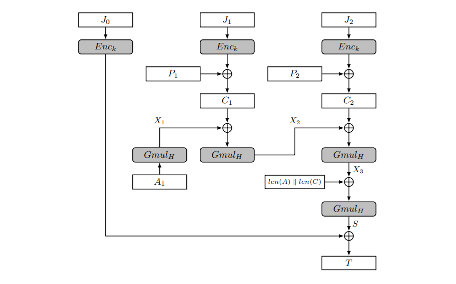- $X_{0}=0$,假设Auth-data占了m个block长度,$X_{i}=Gmul_{H}(X_{i-1}\oplus A_{i})$,for $i\in\{1,..,m\}$