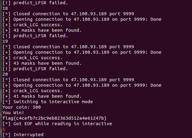 defget_LFSR(): io.sendlineafter("Your choice:\n", "1") cipher = "" for i in range(9): io.sendlineafter("Input your answer:\n", "2333") ct = int(re.findall(r"\d+", io.recvline().decode("utf-8"))[0]) cipher += bin(ct)[2:].rjust(8, "0") cipher = [int(i) for i in cipher] assert(len(cipher) == 72) return cipher