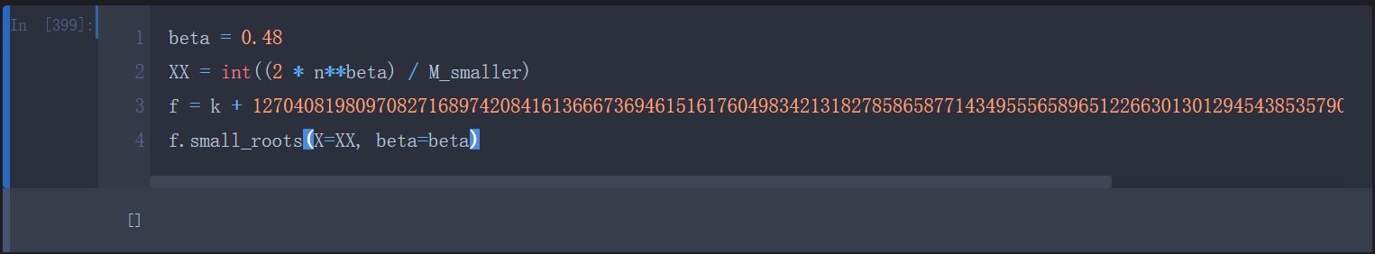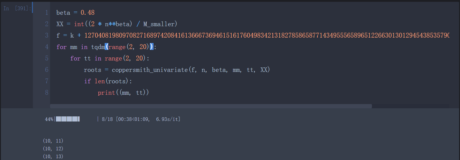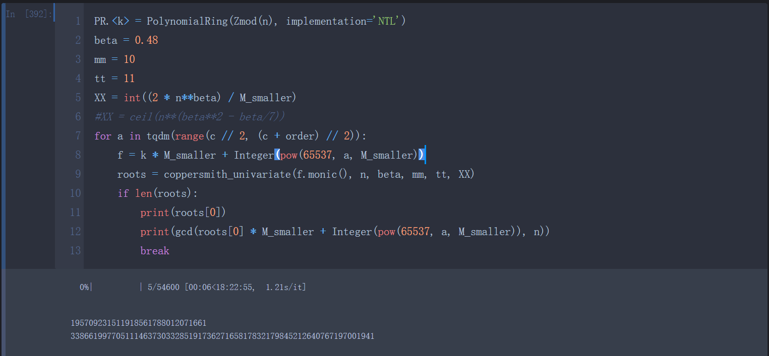 PR.<k> = PolynomialRing(Zmod(n), implementation='NTL') beta = 0.48 mm = 5 tt = 6 XX = int((2 * n**beta) / M_smaller) #XX = ceil(n**(beta**2 - beta/7)) for a in tqdm(range(c // 2, (c + order) // 2)): f = k * M_smaller + Integer(pow(65537, a, M_smaller)) roots = coppersmith_univariate(f.monic(), n, beta, mm, tt, XX) if len(roots): print(roots[0]) print(gcd(roots[0] * M_smaller + Integer(pow(65537, a, M_smaller)), n)) break ''' 0%| | 5/600600 [00:00<17:58:28, 9.28it/s] 1426982562847111986146541 3386619977051114637303328519173627165817832179845212640767197001941 '''