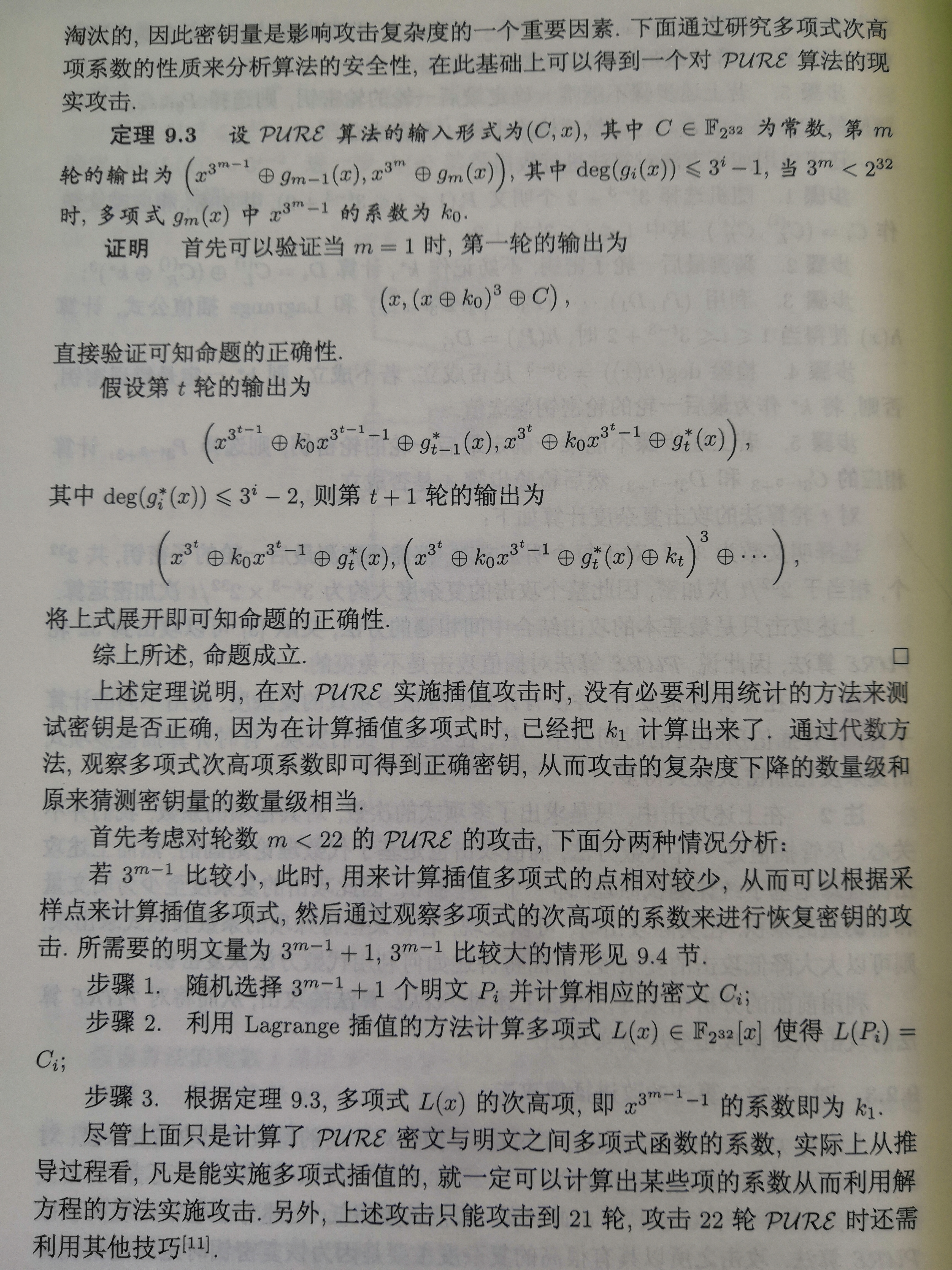 设第i轮后的密文为$(l_{i},r_{i})$,则第i-1轮后的密文为$(r_{i}+(l_{i}+k_{i})^{3},l_{i})=((r_{i}+l_{i}^{3})+l_{i}^{2}k_{i}+l_{i}k_{i}^{2}+k_{i}^{3},l_{i})$