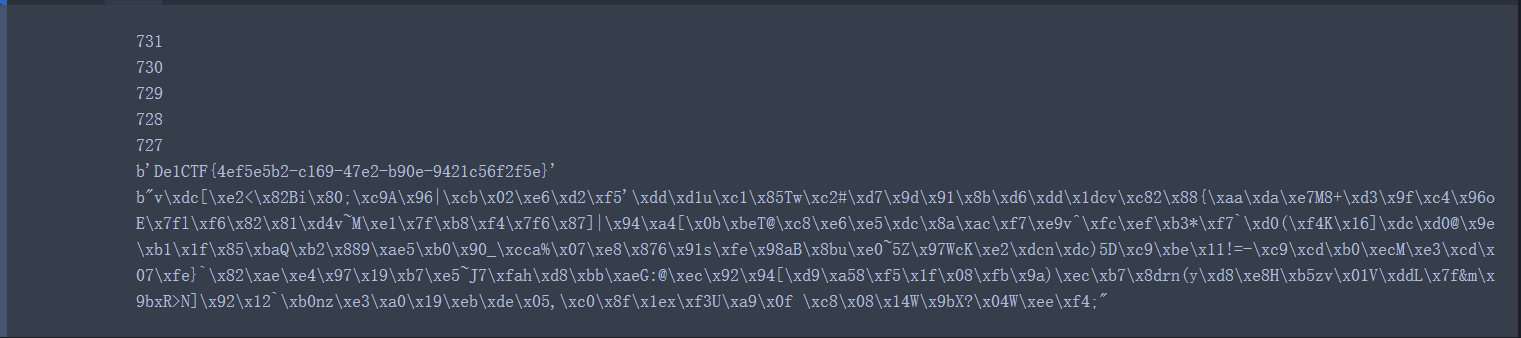b'De1CTF{6a2ddcc3-c729-48f8-b5e0-7574c46a2846}\x04\x04\x04\x04'